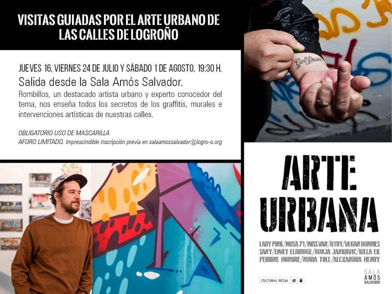 El artista urbano Rombillos inicia mañana jueves una serie de tres visitas guiadas por el arte urbano de las calles de la ciudad organizadas por Cultural Rioja, programa que promueve el Ayuntamiento de Logroño y el Gobierno de La Rioja. Esta iniciativa forma parte de las actividades programadas con motivo de la exposición ‘Arte Urbana’ que se exhibe en la Sala Amós Salvador hasta el 23 de agosto.